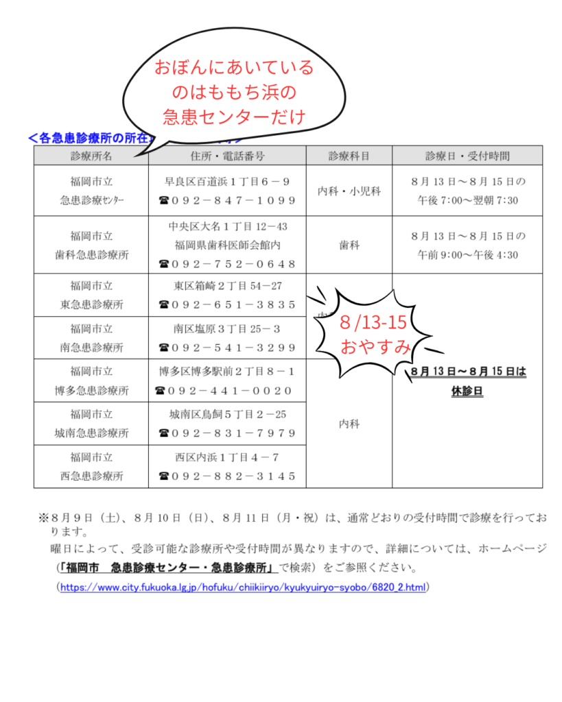 🌐 おやくだちリンク(※福岡市のばあい) - 福岡市立急患診療センター(きゅうかんセンター) tel 092-847-1099(ももち浜)
